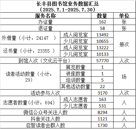 长丰县图书馆2025年7月份服务数据发布